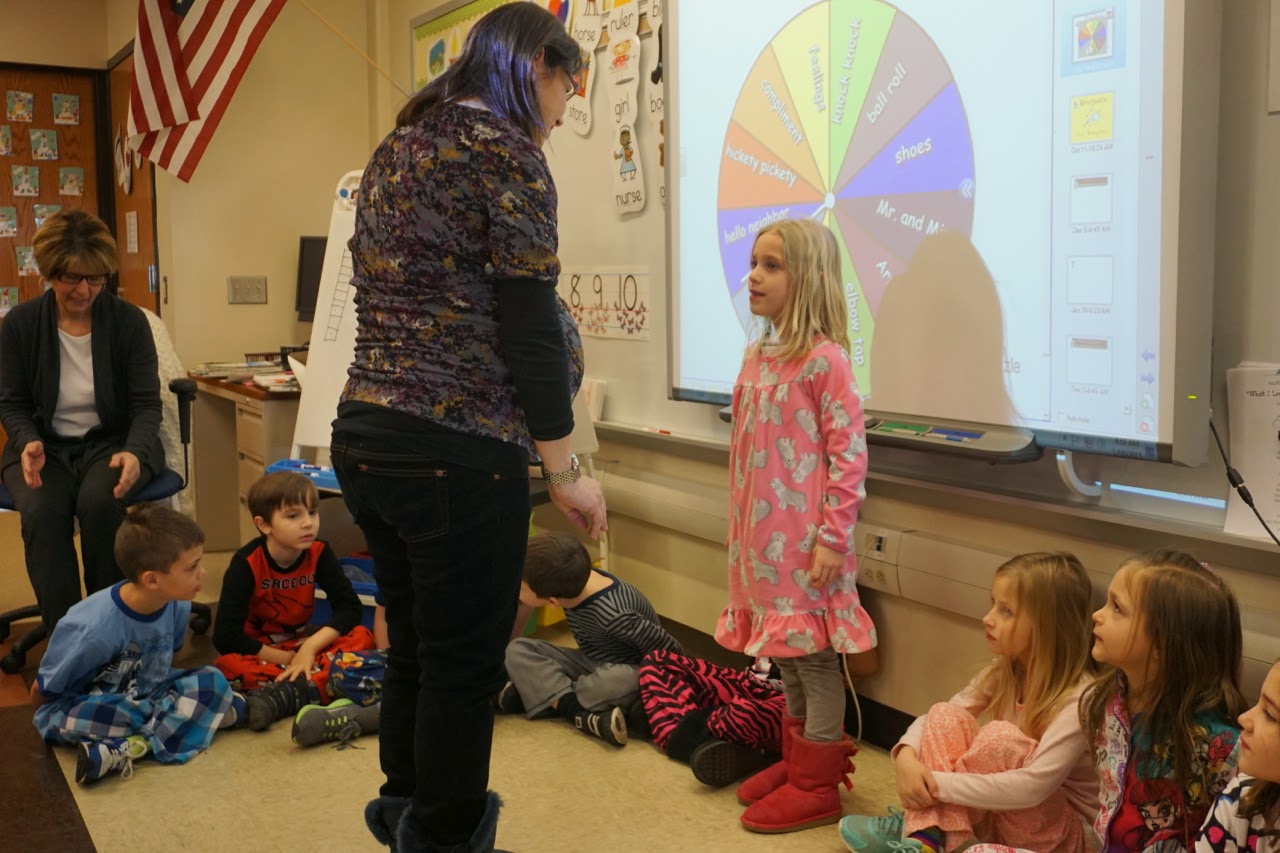 Although there was a sub that day and things weren't going as quickly as they usually go so Amy stepped in a few times. You can take the teacher out of the school...Everyone saying hi to each other. You would think after five months they would be better at each other's last names.